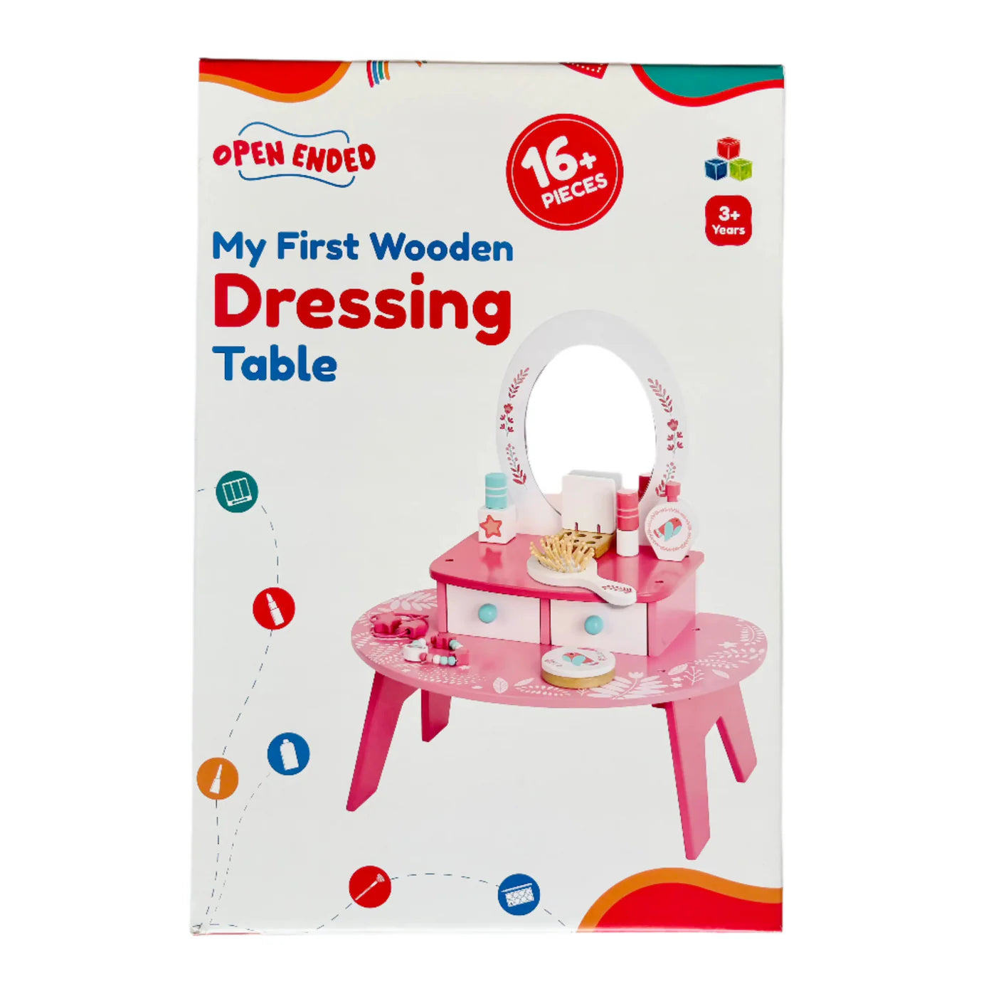 Add glamour to playtime with this beautiful wooden dressing table, made with quality wood and painted with non-toxic paint. This set includes a sturdy table with 2 drawers, a mirror and accessories like lipstick, nail polish, powder, a hair brush and more. Everything you need to make pretend play and dressing up extra fun! This set promotes social and communication skills as they play with siblings, parents or friends.