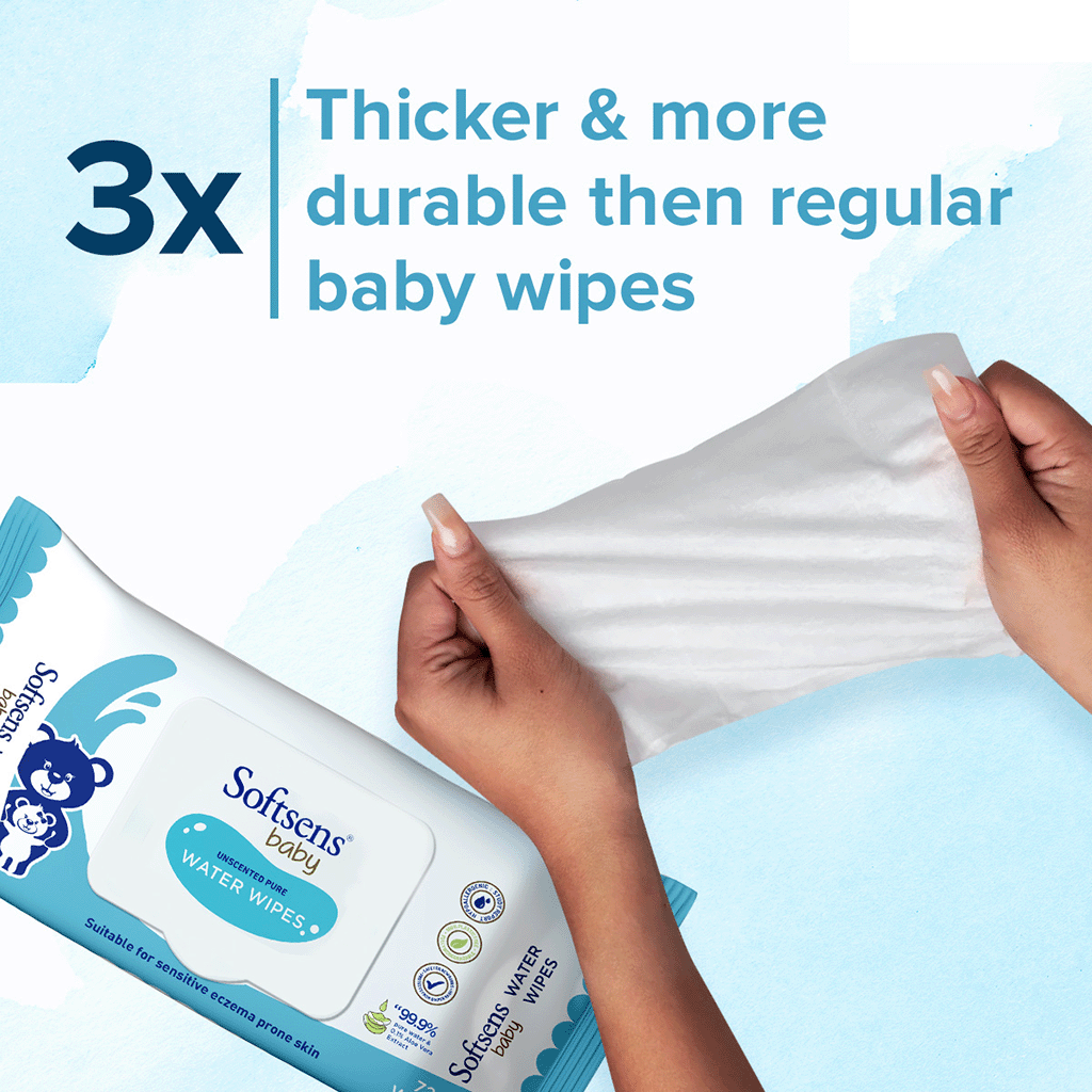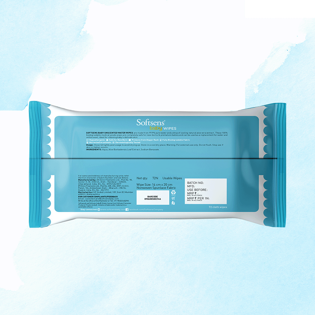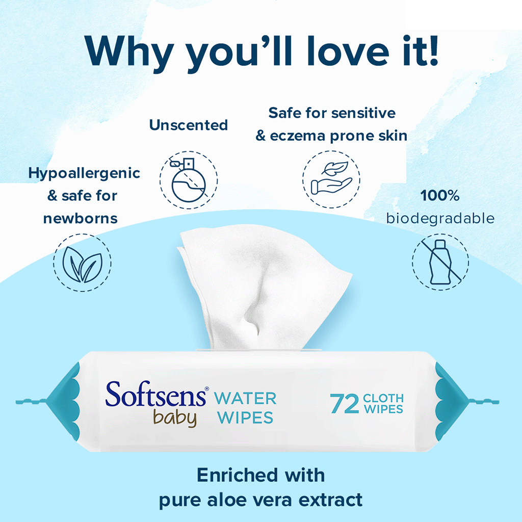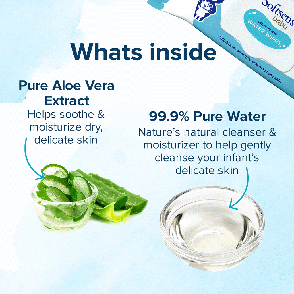 Gently protect & cleanse your infant’s innocent skin with our ultra-mild Water Wipes from Softsens made with 99.9% pure water and 0.1% pure aloe vera extract.