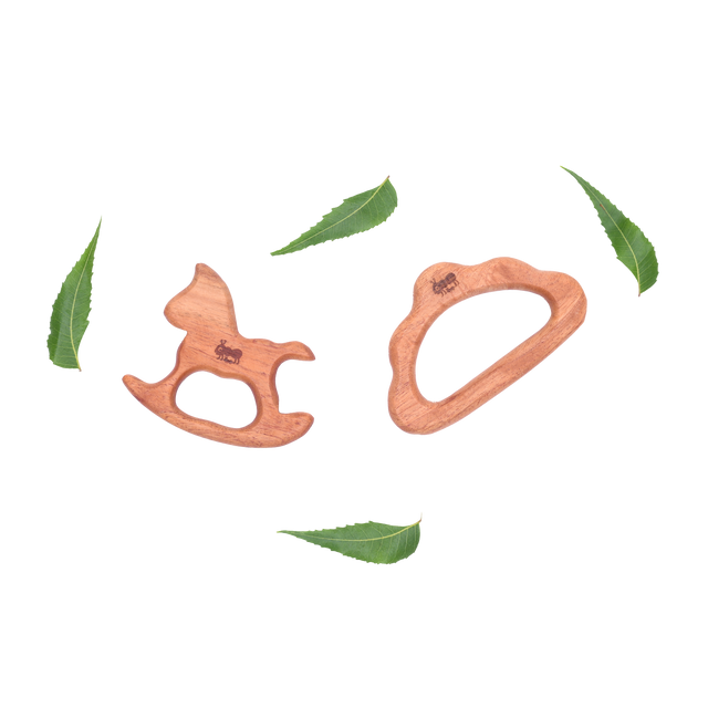 Introducing our adorable set of two baby teethers crafted from natural neem wood, designed to soothe your little one's teething discomfort with style and safety in mind. Featuring charming shapes of a cloud and a rocking horse, these teethers provide relief while stimulating sensory development. The smooth, splinter-free wood is gentle on tender gums, offering a natural alternative to plastic teethers. Compact and lightweight, they are perfect for tiny hands to grasp and explore. Add a touch of whimsy and natural comfort to your baby's teething experience with our delightful baby teethers.