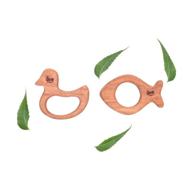 Introducing our adorable set of two baby teethers crafted from natural neem wood, designed to soothe your little one's teething discomfort with style and safety in mind. Featuring charming shapes of a duck and a fish, these teethers provide relief while stimulating sensory development. The smooth, splinter-free wood is gentle on tender gums, offering a natural alternative to plastic teethers. Compact and lightweight, they are perfect for tiny hands to grasp and explore. Add a touch of whimsy and natural comfort to your baby's teething experience with our delightful baby teethers.